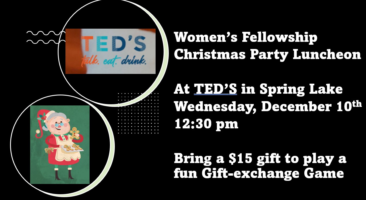 Women's Annual Christmas Party/Lunch to be held at TED's in Spring Lake at 12:30 PM on Wednesday, December 10th. Even if you have never attended a women's event, try this one. We have so much fun! There will be a sign up coming soon. Plan to bring a $15 gift for a "gift exchange game". Also, just so you know...you will order & pay for your own lunch. Hope to see you there!