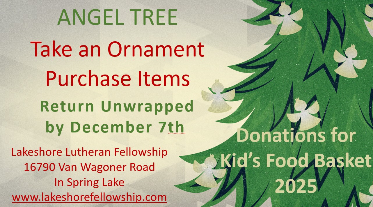 This year's Angel Tree donations will go to support Kids' Food Baskets of Ottawa/Muskegon Counties. Please take an ornament from the tree and return the items by Sunday, December 7th. Then, we will have a packing event that day following service. Please either donate goods or help us assemble the snack packs. Thank you!