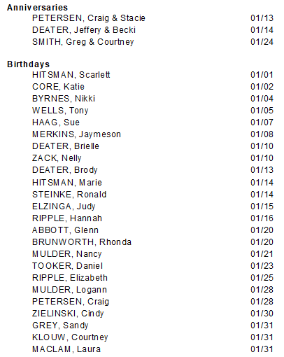 Note: If your anniversary or birthday is missing from this list, please update the church office. Thank you!